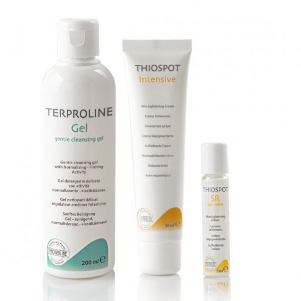 How To Use - AM & PMStep OneTerproline® Gentle Cleansing Gel: Use morning and evening at the start of your skincare routine to cleanse the skin to prepare for further steps.Step TwoThiospot® Intensive: For extensive dark areas, apply a small amount to the selected area and massage into the skin in the morning and in the evening. Cleanse and tone before applying. Moisturising cleansers may act as a barrier to absorption. Thiospot® is compatible with make-up. 30/60 day treatment.Step ThreeThiospot® Skin Roller: For best results apply the roller tip to the desired area and apply using a light pressure and a gentle massaging action twice a day. Leave skin to dry naturally before applying moisturiser or make-up. Cleanse and tone before applying. Moisturising cleansers may act as a barrier to absorption. Thiospot® is compatible with make-up. 30/60 day treatment.Please allow 4 to 8 weeks for Thiospot’s ingredients to be built up in the skin so to reach a level where results may start to show. Continue use until new lighter skin cells replace old, darker cells. This allows the lighter skin cells enough time to reach the skin’s surface as the darker cells are shed away. Results improve with continued use. Once skin is normalised, slowly withdraw the product.Step FourSunwards®: Apply all over the face and gently rub in until fully absorbed to protect the skin from UV exposure.Can Thiospot® be used as your main pigmentation treatment?Yes. The key ingredients change the skin to directly target the key melanin (pigment) making process but without damaging the skin's ability to make pigment long term. One should be wary of other products containing hydroquinone and hydroquinone releasing ingredients such as bearberry and arbutin containing creams.Can Thiospot® be used with other pigmentation treatments?We have found adding in other things like mild exfoliating cleansers and ascorbic acid (vitamin C) containing products can improve results further. Lastly for resistant pigmentation, we use clinic treatments for difficult situations.What is the real innovation of the pigmentation therapy with Thiospot® products?Thiospot utilises 4 ingredients synergistically. Each ingredient can work on its own to reduce pigment production and each works on a different stage of the pigment manufacturing process. The 4 ingredients together combine to give a result as good as a 4% hydroquinone cream but without the associated risks being reported with hydroquinone cream related to cancer.Can you buy individual packs of Thiospot®?Yes. However - Thiospot® Cream is for large pigmented areas like the forehead or cheek area and for conditions such as mask of pregnancy. Smaller marks can be treated effectively with the Thiospot® Skin Roller. If there are lots of small marks, consider the cream. Thiospot® normalises pigment production, it does not whiten skin. Combining the skin roller and applying to the slower reacting areas and then applying the cream can work synergistically and increase the results.How long does it take for Thiospot® to work?Thiospot® can start to reduce pigmentation around 4 weeks but may take 6 to 10 weeks.Can I use Thiospot® alongside other pigmentation treatments?Yes, but be aware of skin exfoliating products and combining them which can make the area sore.Are there any side effects with Thiospot®?Side effects are very rare. Some people may be sensitive to any ingredient so we always recommend patch testing for 48 hours. We rarely have a problem and if you do we will refund your money.Can I use Thiospot® while pregnant and breastfeeding?We have no data to support usage or not, and so it is not recommended.Who is Thiospot® designed for? (e.g. males, females, teenagers,)Thiospot is designed for pigmentation types whether it is sun damage, sun spots, age spots, melasma, or pregnancy mask. However different pigmentations can have different features and causes and one may need to vary their treatment programme.How long will the products last?In average we get repeat purchases every 8 weeks.Will Thiospot® work?Thiospot is a highly effective pigmentation treatment and works in over 75% of those who use it, and works for the long term. 25% get complete resolution and can stop using once the pigmentation has gone. 25% it will reduce almost completely and one can stop usage and it will remain almost clear (clear so no-one else would notice) and in 25% of people it reduces it effectively but if one stops using Thiospot it will come back and so a maintenance dose is needed to keep the area clear.Has it been tested on animals?None of the products have been tested by us or the manufacturer on animals. This is important to us and the research company behind the products.Does Thiospot® contain Parabens?No parabens of any sort are used as a preservative in Thiospot or any of the company’s products.Is Thiospot® safe to use in the sun?Thiospot® is safe to use in the sun. Ensure that the Thiospot® is completely absorbed. Once fully absorbed, it is essential to apply a high factor sunscreen such as the Sunwards®.